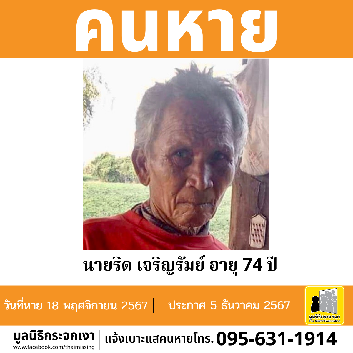 ผู้ใดพบเห็นโปรดแจ้งมูลนิธิกระจกเงา โทร. 095 631 1914
