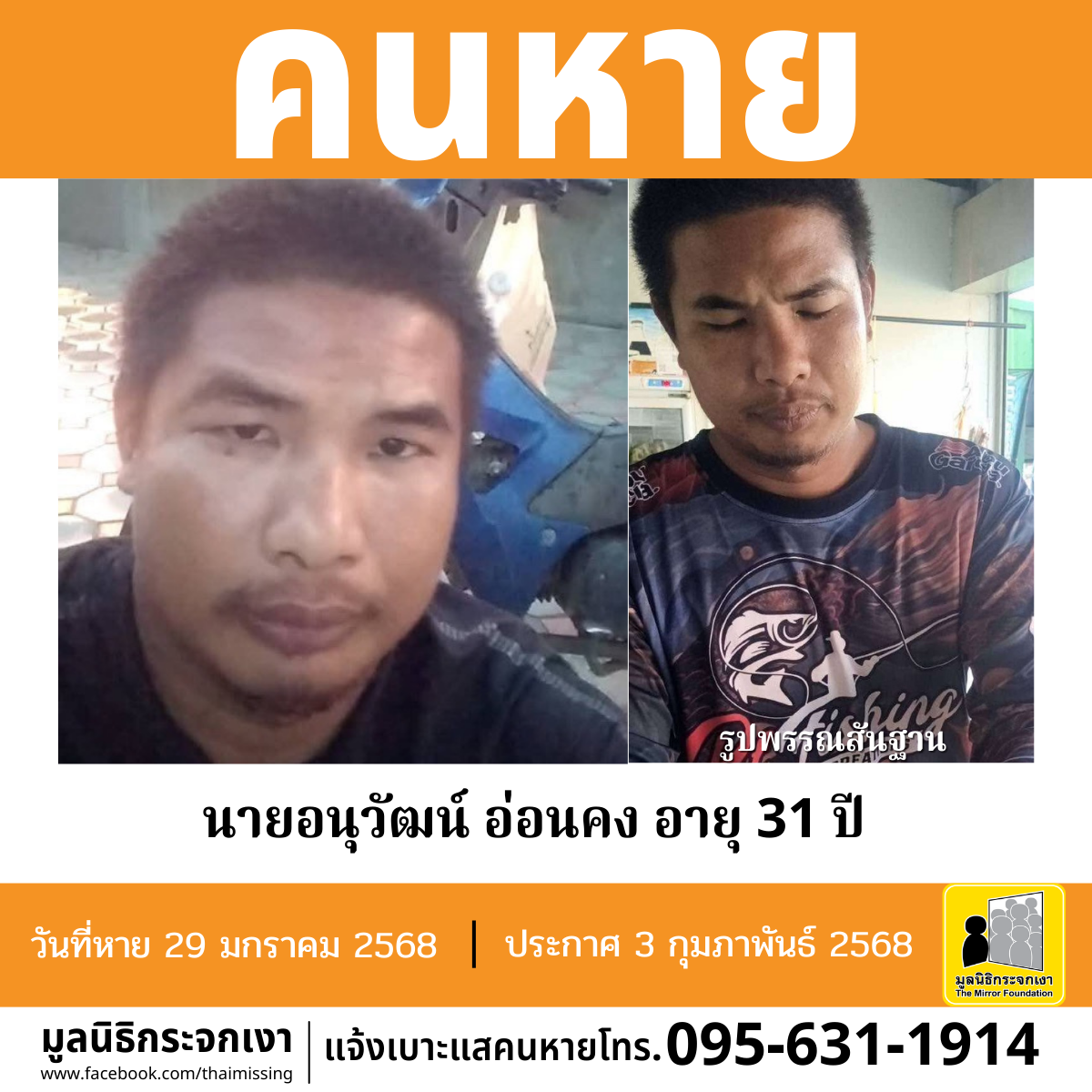 ชื่อ นายอนุวัฒน์ อ่อนคง หรือ นุ อายุ 31 ปี หายออกจากบริเวณ หมู่ที่ 3 ตำบลนายม อำเภอมืองเพชรบูรณ์ จังหวัดเพชรบูรณ์ เมื่อวันที่ 29 มกราคม 2568 เวลาประมาณ 09.00 น.
