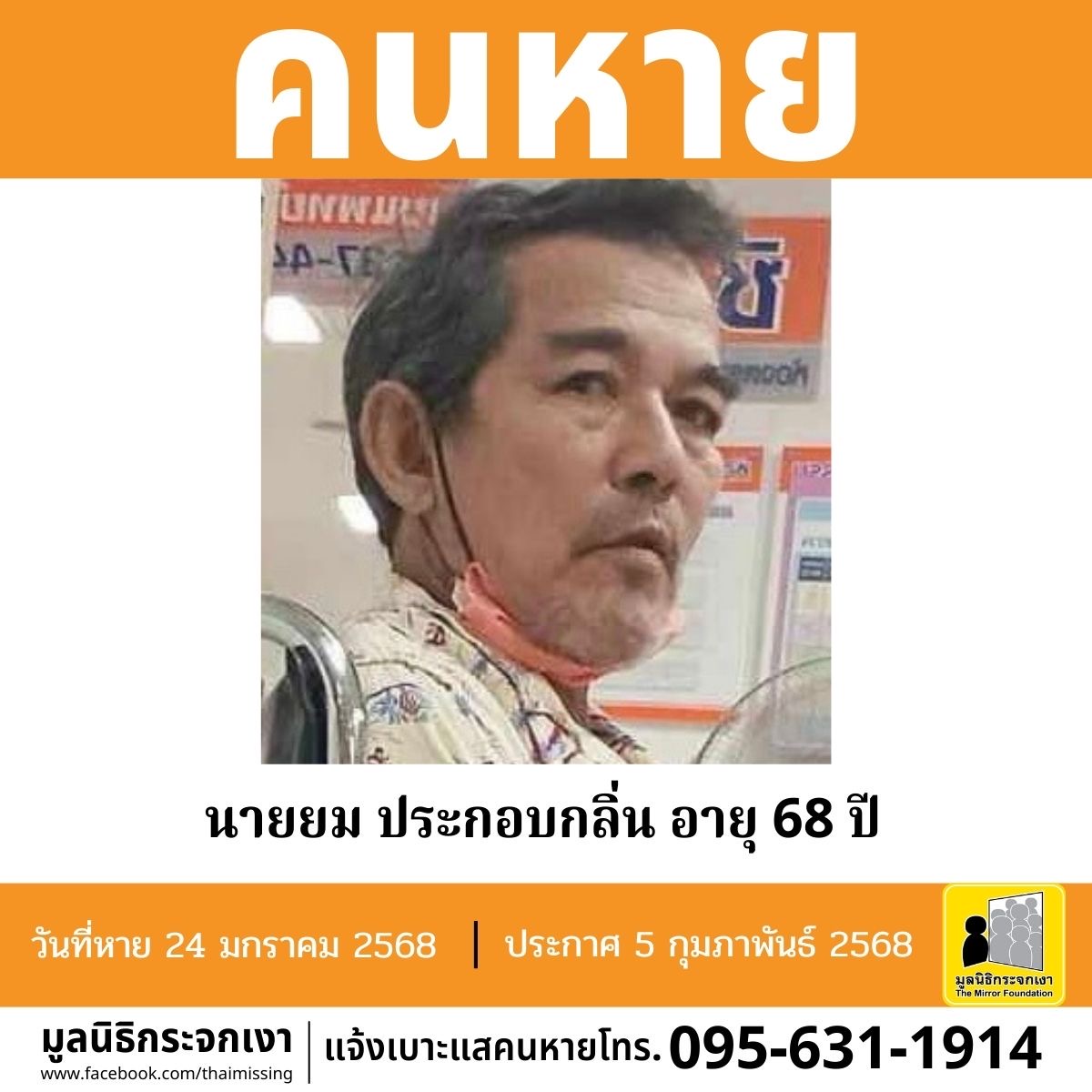 ชื่อ นายยม ประกอบกลิ่น อายุ 68 ปี หายออกจากบริเวณซอย 8 (ซอยโรงเรียนโคราชพิทยาคม) ถนนมิตรภาพ ตำบลในเมือง อำเภอเมืองนครราชสีมา จังหวัดนครราชสีมา เมื่อวันที่ 24 มกราคม 2568