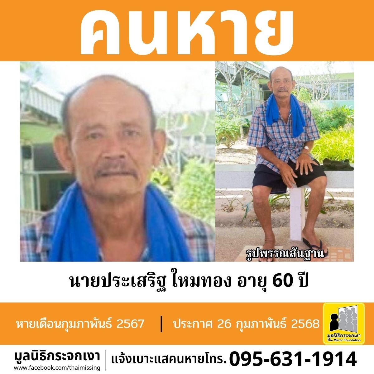ชื่อ นายประเสริฐ ใหมทอง หรือ เสริฐ / งาว อายุ 60 ปี หายออกจากบริเวณถนนอ่อนนุช แขวงพระโขนงเหนือ เขตวัฒนา กรุงเทพมหานคร เมื่อเดือนกุมภาพันธ์ 2567